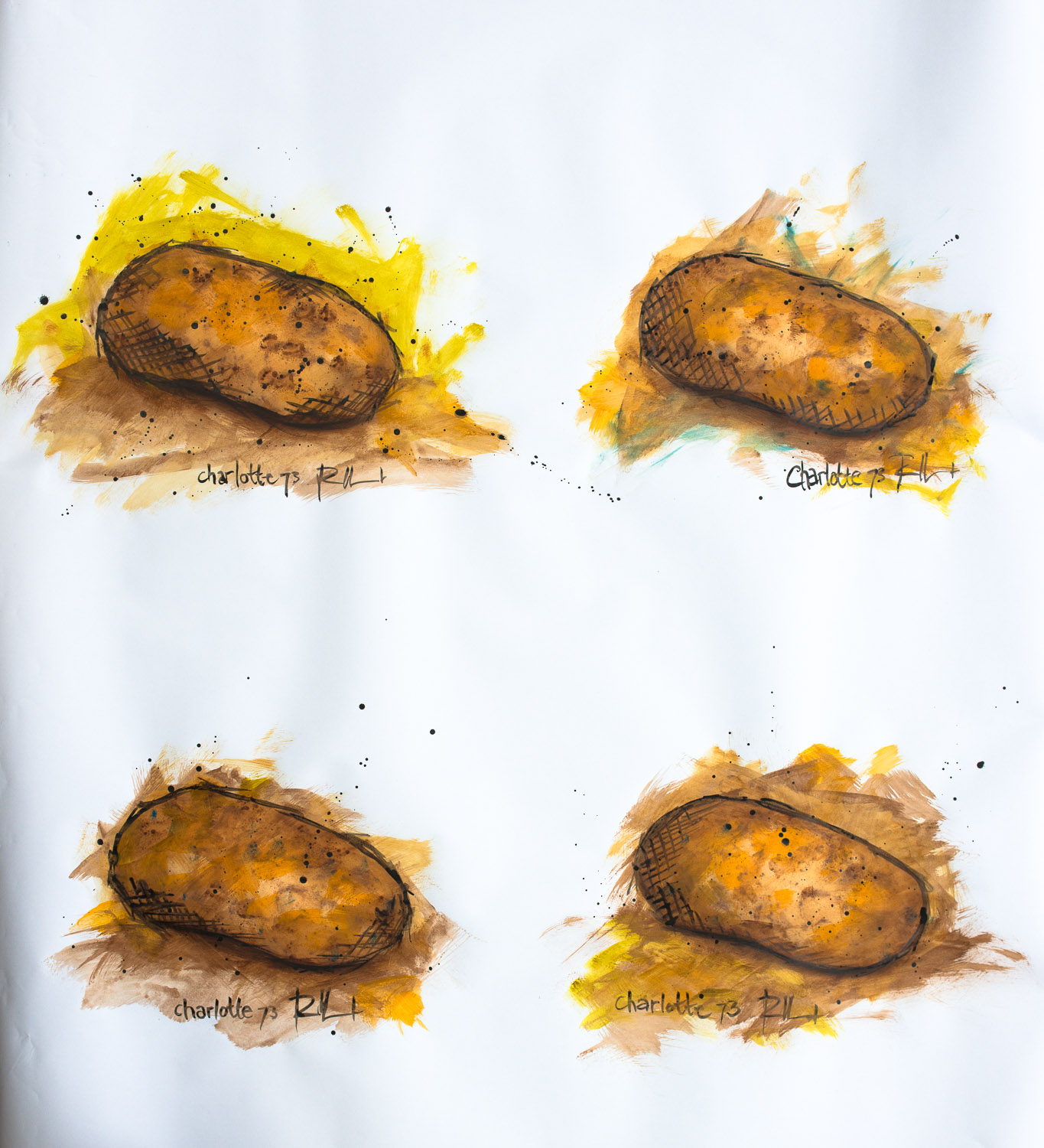 Wist u dat botanicus Carolus Clusius de aardappel (Solanum tuberosum) in 1593 naar Nederland bracht? En dat het ruim 200 jaar duurde voor dat deze als prima voedsel werd geaccepteerd? Rond 1900 werd er met de aardappel lustig op los veredeld. Ondermeer door de Friese hoofdonderwijzer Kornelis Lieuwes de Vries die in 1905 het Bintje introduceerde. Later de klassieke Nederlandse aardappel. Bintje schijnt vernoemd te zijn naar zijn toen 17-jarige lievelingsleerlinge Bintje Jansma. Ik weet niet of je daar nu nog mee weg komt. In elk geval inspireerde het mij om verschillende aardappelrassen met meer of minder welluiddende namen te portretteren. Ik ben ongelooflijk benieuwd welke verhalen daar allemaal achter zitten. Het Bintje is na aandringen van de milieubeweging uit de schappen verdwenen en Bintje Jansma overleed in 1976 op 88 jarige leeftijd in een rusthuis in Franeker.