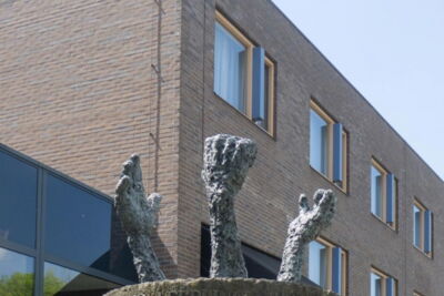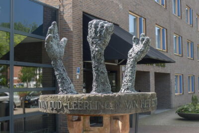 Het Rijn IJssel College vroeg me een vervangend beeld te maken op de gemankeerde sokkel. Dat zijn 3 bronzen handen geworden die 3 belangrijke