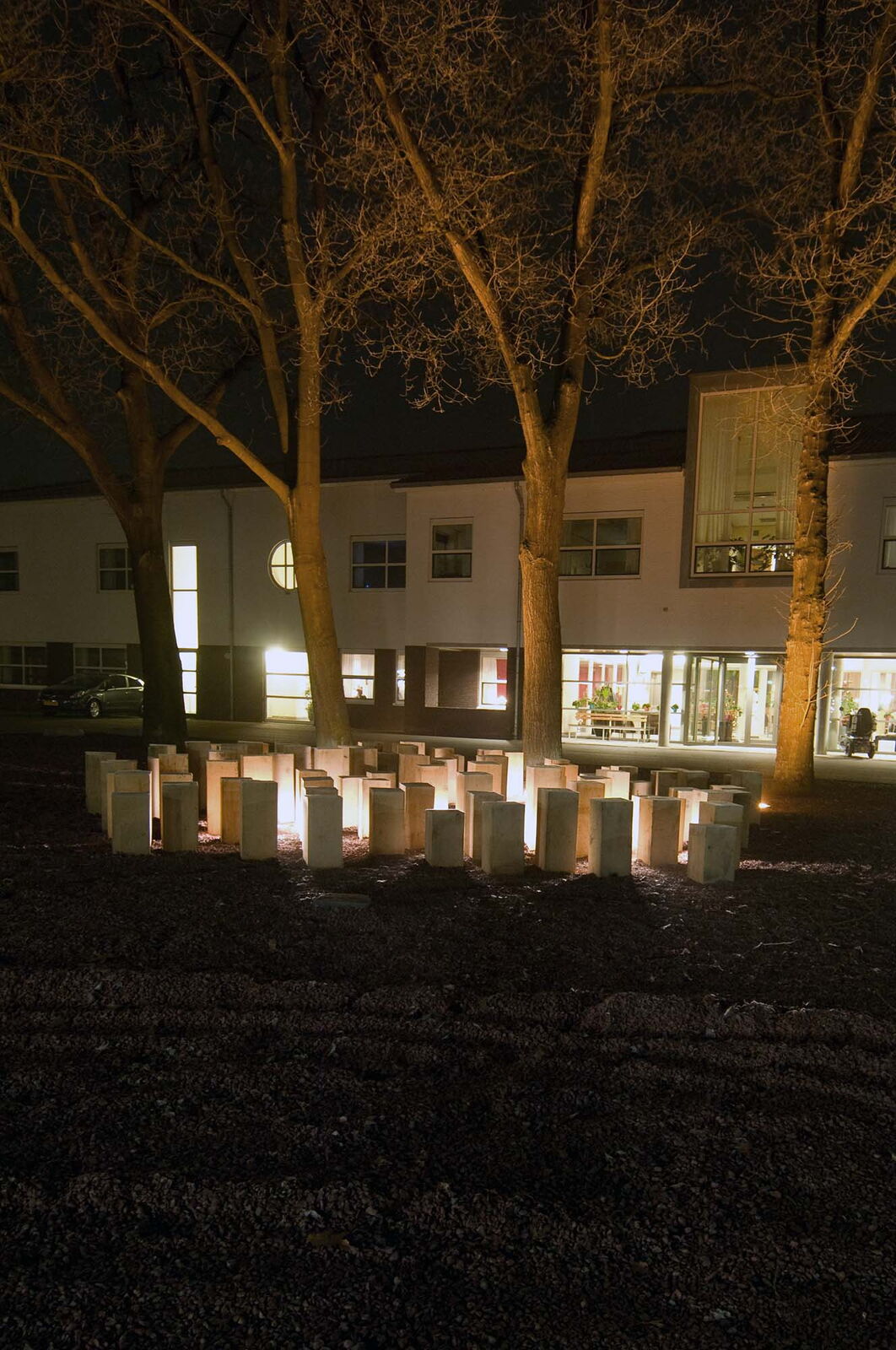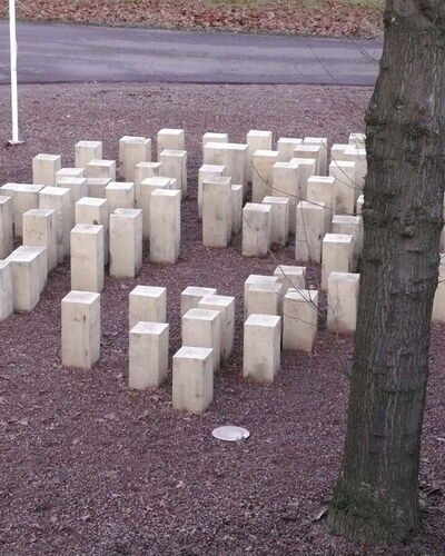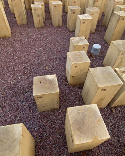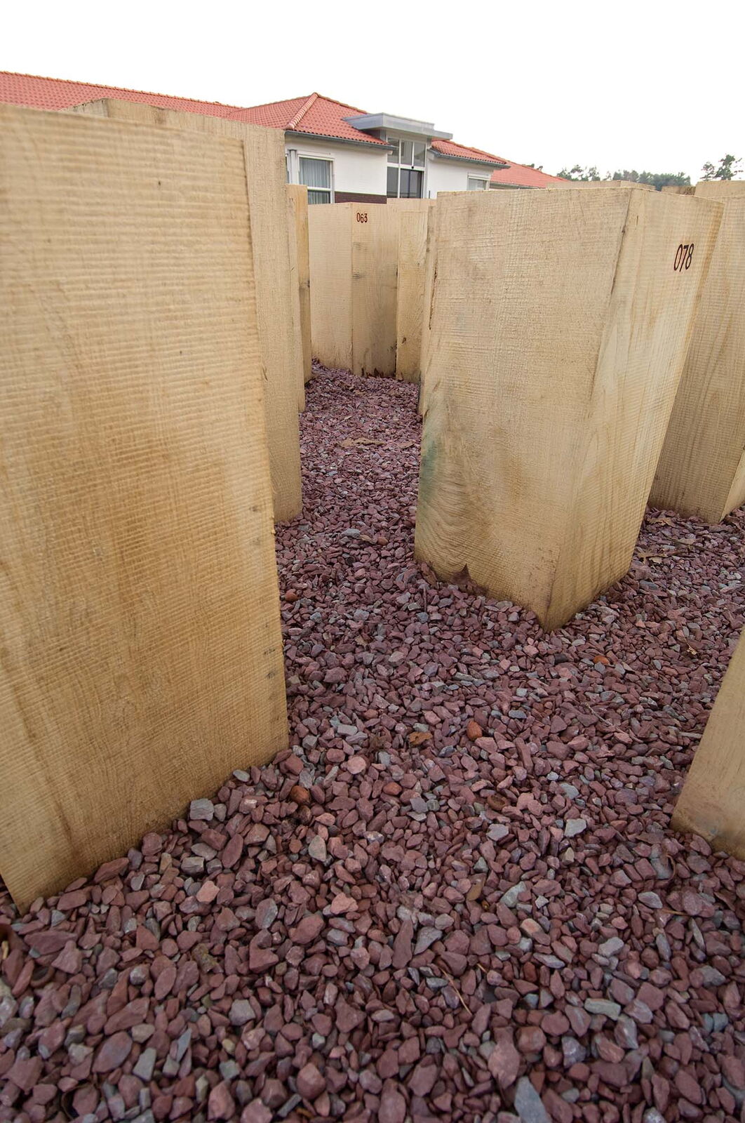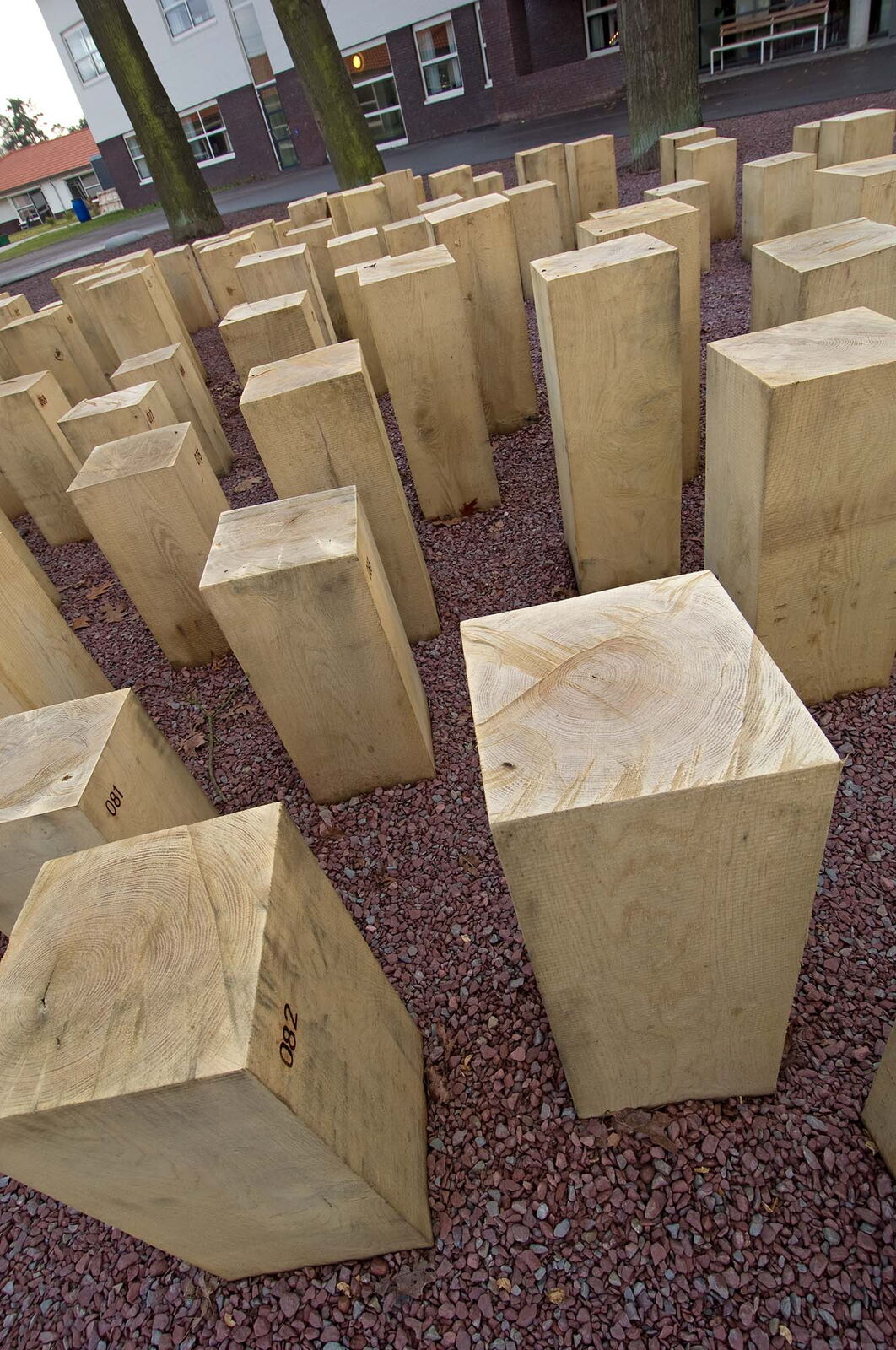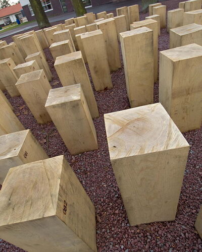 Voor zorginstelling Markenhof in Beekbergen waar ondermeer mensen met het syndroom van Korsakov wonen maakte ik een monumentaal kunstwerk bij de ingang van het hoofdgebouw. Het bestaat uit genummerde houten huisjes van inlands eiken die op de kop in de grond zijn geplaatst. Het leven van de bewoners van de