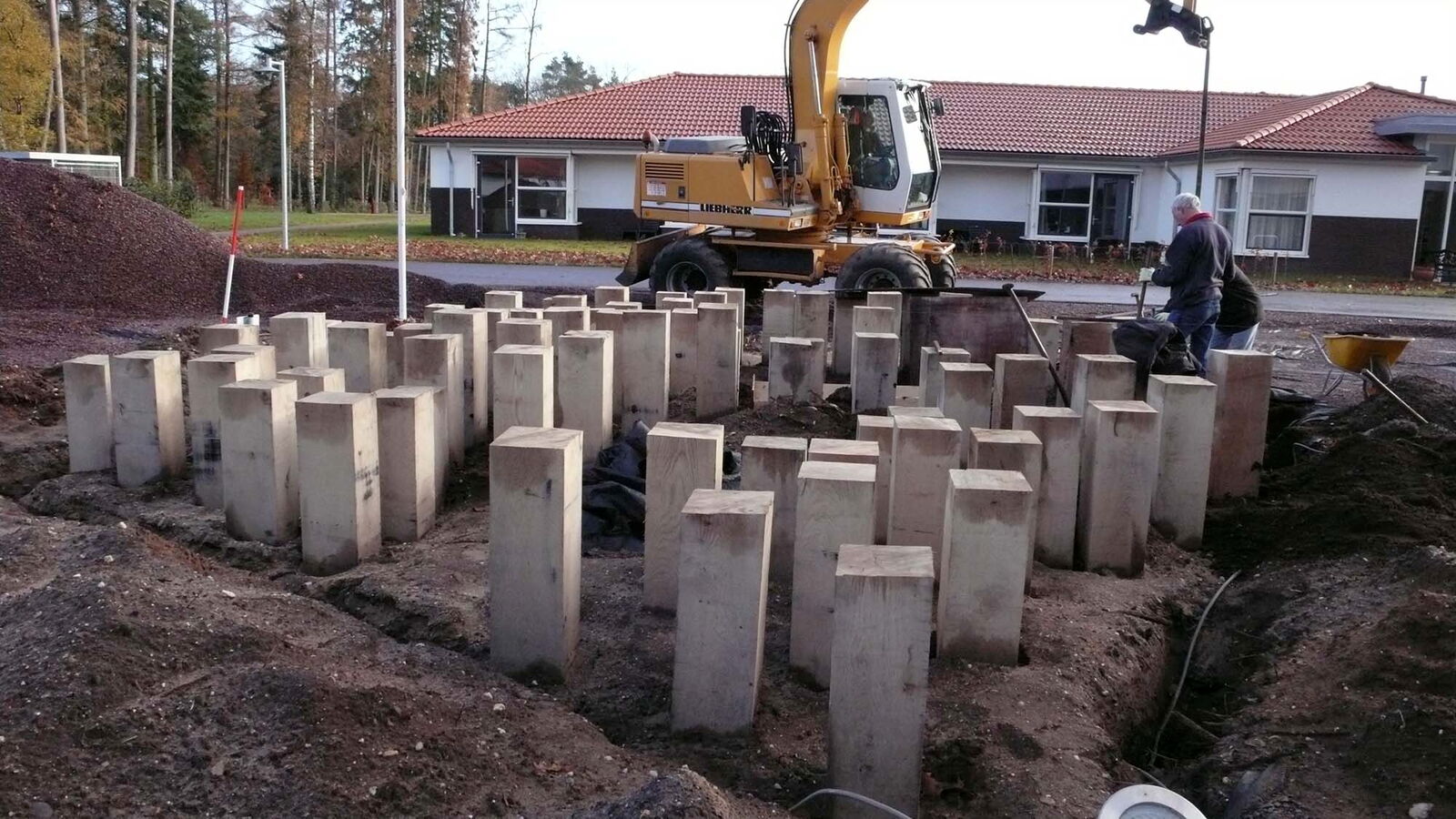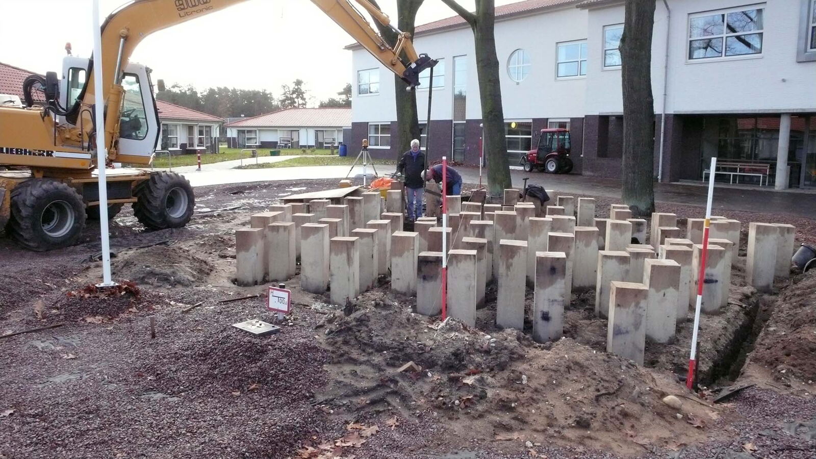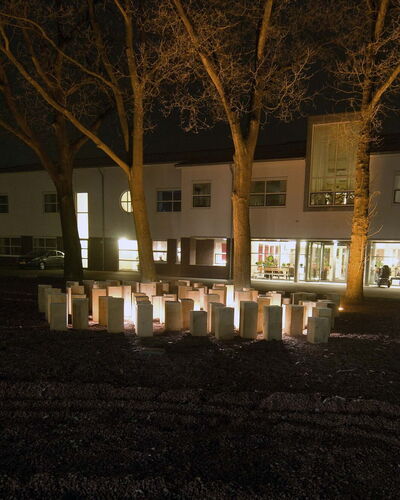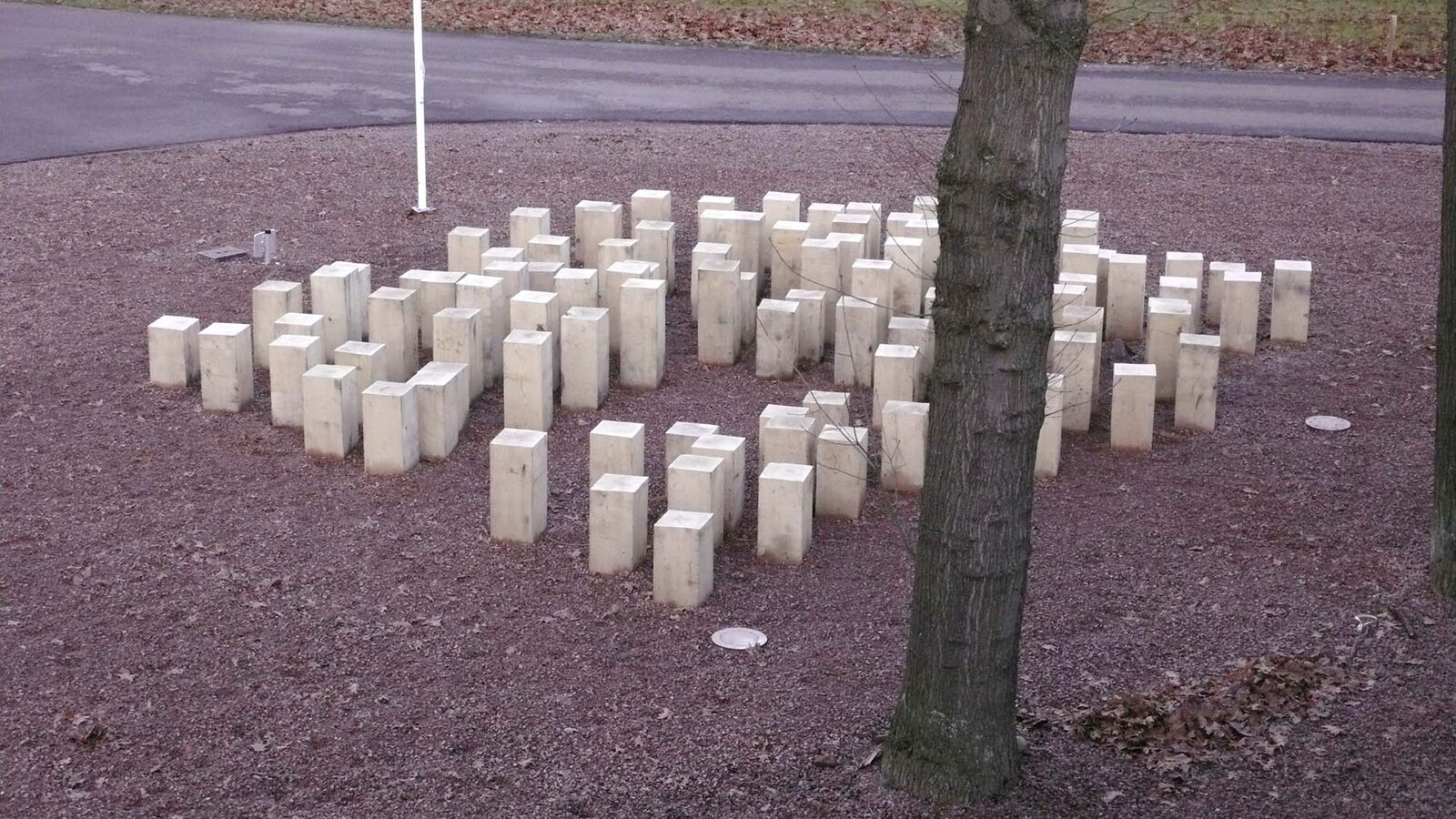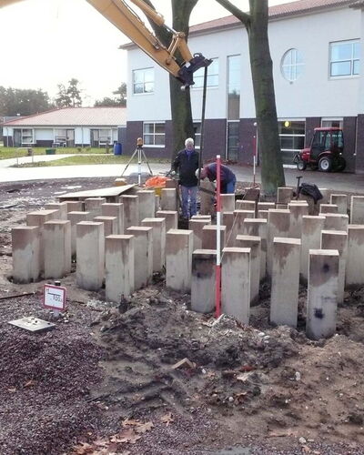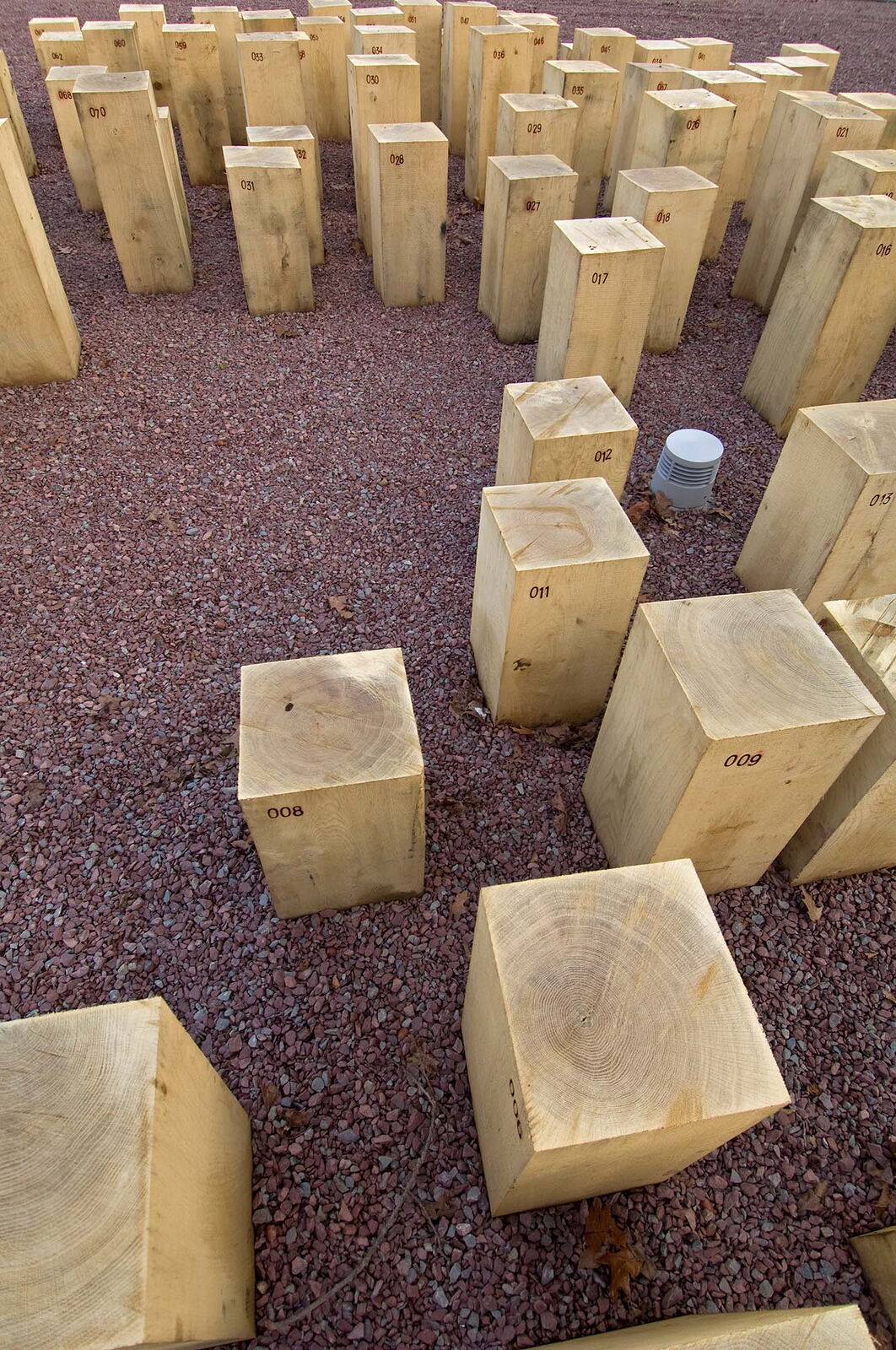 Voor zorginstelling Markenhof in Beekbergen waar ondermeer mensen met het syndroom van Korsakov wonen maakte ik een monumentaal kunstwerk bij de ingang van het hoofdgebouw. Het bestaat uit genummerde houten huisjes van inlands eiken die op de kop in de grond zijn geplaatst. Het leven van de bewoners van de