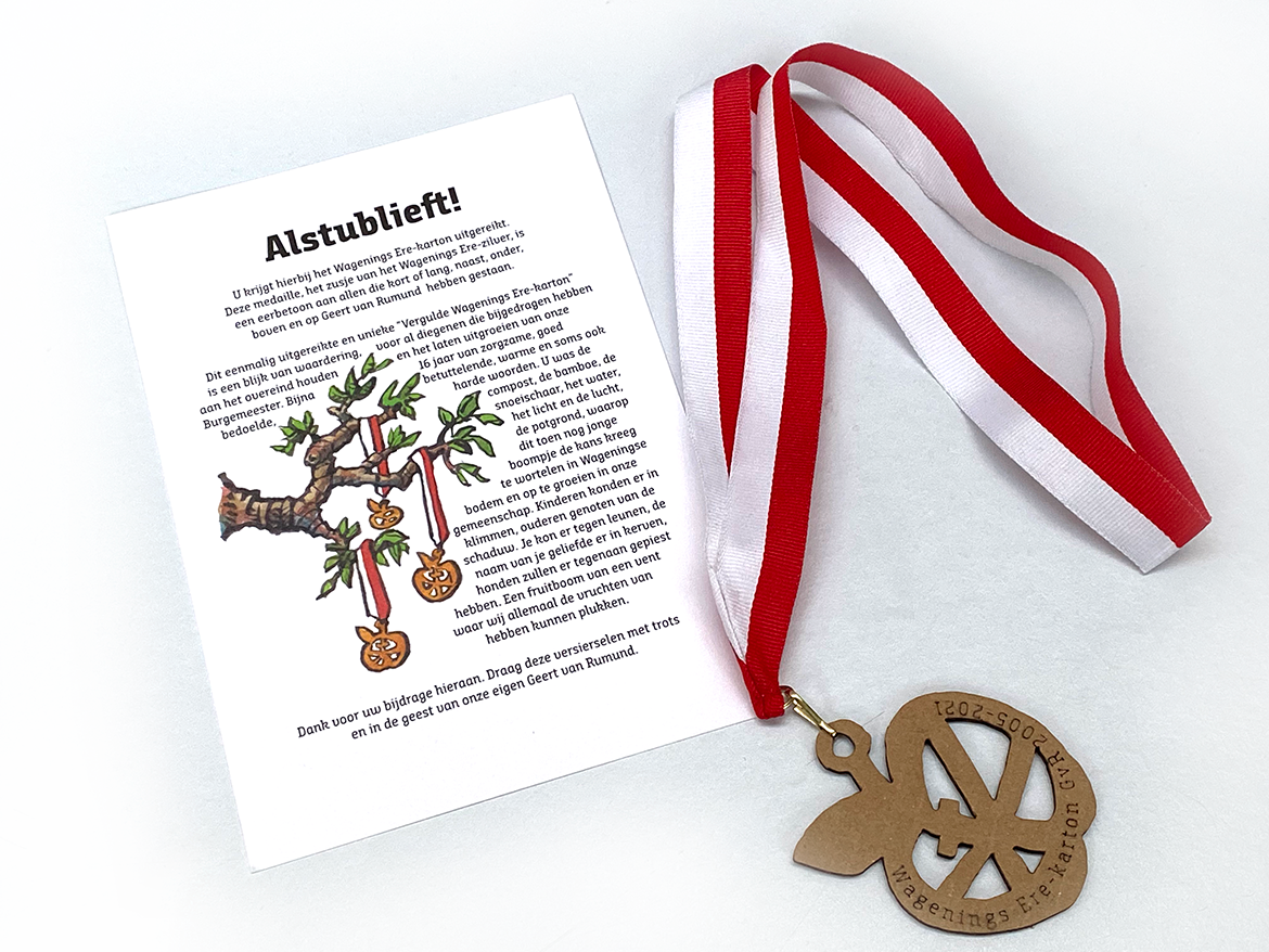 Voor die gelegenheid bedacht ik samen met Henk van Ruitenbeek het Wagenings Ere-Karton. In de eerste plaats om iedereen die met de afscheidnemende burgemeester Geert van Rumund had samengewerkt daarvoor te bedanken. Maar ook om daarna te pas of zelfs te onpas Wageningers te kunnen bedanken voor hun goede werken.